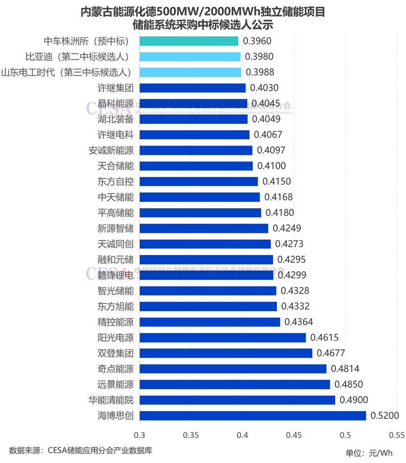 本次采購(gòu)共分為三個(gè)標(biāo)段,共計(jì)1.3GW/5.2GWh,共吸引了25家企業(yè)角逐,報(bào)價(jià)區(qū)間在0.3921-0.52元/Wh,平均報(bào)價(jià)0.4306元/Wh。最終,中車株洲所、比亞迪、山東電工時(shí)代、東方自控、許繼電科這5家企業(yè)入圍,中車株洲所、比亞迪、山東電工時(shí)代分別預(yù)中標(biāo)其中一個(gè)標(biāo)段,預(yù)中標(biāo)價(jià)格均低于0.4元/Wh。