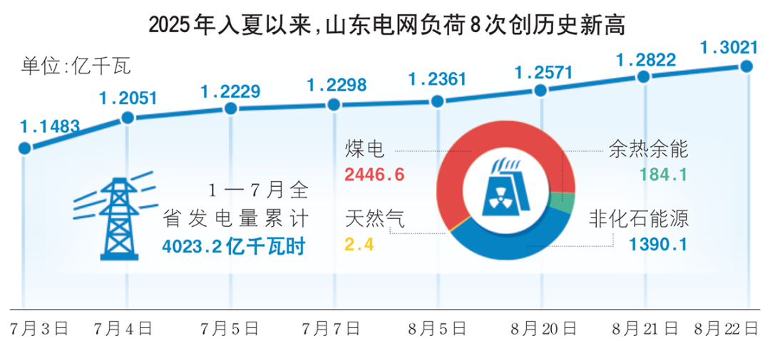 7月以來,包括山東在內(nèi),全國多地出現(xiàn)多輪高溫,全國平均氣溫創(chuàng)1961年以來歷史同期新高。伴隨高溫天氣頻發(fā),全國多地迎來用電高峰。截至8月1日,全國最高用電負(fù)荷已四次創(chuàng)歷史新高,最高達(dá)到15.08億千瓦,較去年極值提高5700萬千瓦。