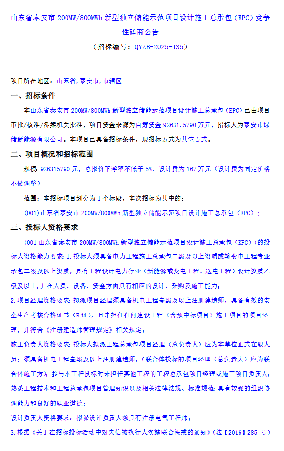 中國(guó)儲(chǔ)能網(wǎng)訊:8月23日,山東省泰安市200MW/800MWh新型獨(dú)立儲(chǔ)能示范項(xiàng)目設(shè)計(jì)施工總承包(EPC)競(jìng)爭(zhēng)性磋商公告發(fā)布。項(xiàng)目招標(biāo)人為泰安市綠儲(chǔ)新能源有限公司,項(xiàng)目位于山東省泰安市市轄區(qū),項(xiàng)目資金來(lái)源為自籌資金92631.579萬(wàn)元,總報(bào)價(jià)下浮率不低于 5%,設(shè)計(jì)費(fèi)為 167 萬(wàn)元(設(shè)計(jì)費(fèi)為固定價(jià)格不做調(diào)整),折合單價(jià)1.158元/Wh。