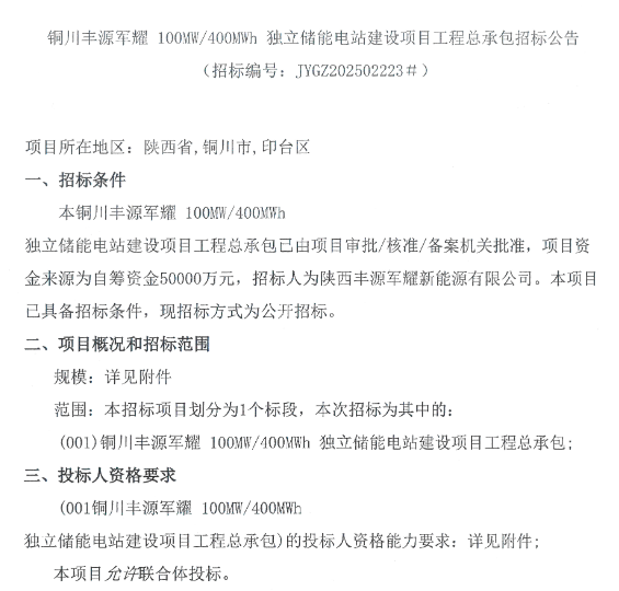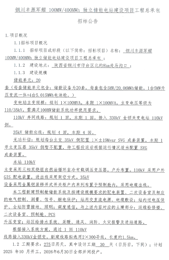 中國儲能網(wǎng)訊:8月22日,陜西豐源軍耀新能源有限公司發(fā)布銅川豐源軍耀 100MW/400MWh 獨(dú)立儲能電站建設(shè)項(xiàng)目工程總承包招標(biāo)公告。項(xiàng)目位于陜西省銅川市印臺區(qū),儲能規(guī)模100MW/400MWh,共包括儲能單元20套(每套儲能單元包含5MW/20.06MWh儲能,1臺5MW壓變流一體+4臺5.015MWh電池艙。)