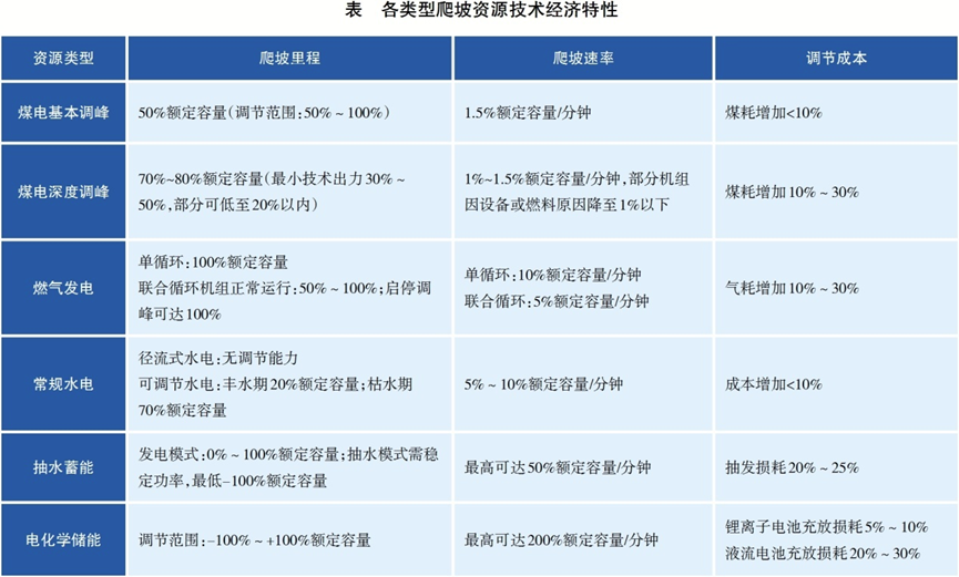 系統(tǒng)爬坡能力需基于各類型爬坡資源技術經濟特性開展分析。從爬坡速率和里程等調節(jié)性能看,電化學儲能和抽水蓄能普遍優(yōu)于煤電、氣電等火電電源,可調節(jié)水電枯水期的調節(jié)能力優(yōu)于豐水期;從調節(jié)成本看,煤電基本調峰和常規(guī)水電調節(jié)成本較低,氣電調峰次之,抽水蓄能與電化學儲能的成本取決于抽發(fā)電價差與轉換效率,煤電深度調峰成本較高。