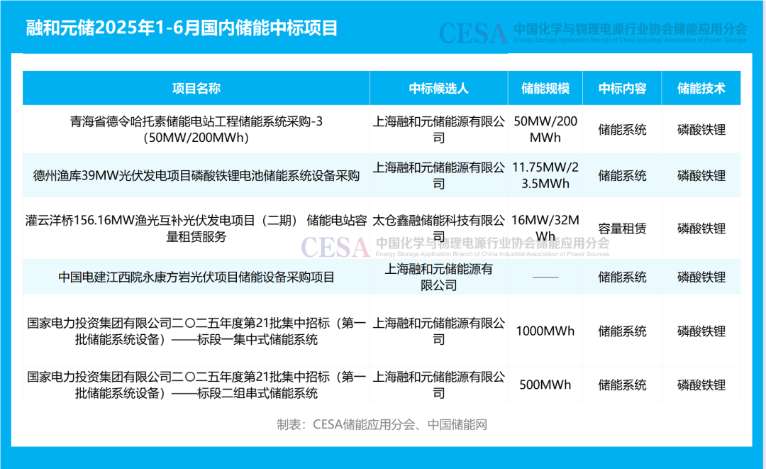 從訂單表現(xiàn)來(lái)看,2025年1—6月融和元儲(chǔ)在國(guó)內(nèi)儲(chǔ)能招標(biāo)中表現(xiàn)活躍,累計(jì)參與超10個(gè)項(xiàng)目,涵蓋電網(wǎng)側(cè)獨(dú)立儲(chǔ)能、電源側(cè)光伏配儲(chǔ)、用戶(hù)側(cè)工商業(yè)儲(chǔ)能及集采框架四大領(lǐng)域。作為第1中標(biāo)候選人,其先后中標(biāo)青海德令哈(50MW/200MWh,9220萬(wàn)元)、德州漁庫(kù)(11.75MW/23.5MWh,1574.5萬(wàn)元)等項(xiàng)目,并在國(guó)家電投首批儲(chǔ)能集采中斬獲組串式標(biāo)段500MWh訂單(23575萬(wàn)元),顯示出較強(qiáng)的市場(chǎng)競(jìng)爭(zhēng)力。