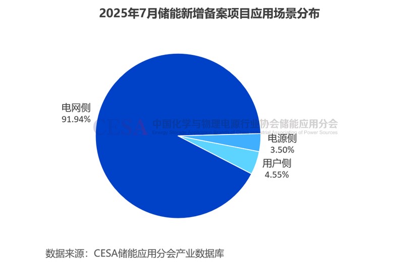 據(jù)CESA儲能應(yīng)用分會產(chǎn)業(yè)數(shù)據(jù)庫不完全統(tǒng)計(jì),2025年7月,國內(nèi)電網(wǎng)側(cè)儲能新增備案已披露規(guī)模49.19GW/128.37GWh,占比91.44%(功率)/91.94%(容量);電源側(cè)儲能新增備案1.44GW/4.89GWh,占比2.68%(功率)/3.50%(容量);用戶側(cè)儲能新增已披露規(guī)模2.96GW/6.36GWh,占比5.50%(功率)/4.55%(容量)。