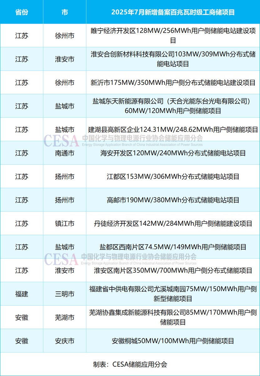 表 2025年7月新增備案百兆瓦時(shí)級工商儲項(xiàng)目