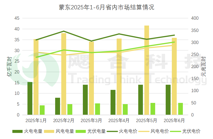 2025年1-6月,蒙東省內(nèi)市場累計結算電量328.36億千瓦時,其中火電結算電量77.02億千瓦時,結算均價321.04元/兆瓦時;風電結算電量220.44億千瓦時,結算均價265.1元/兆瓦時;光伏結算電量30.9億千瓦時,結算均價270.39元/兆瓦時。