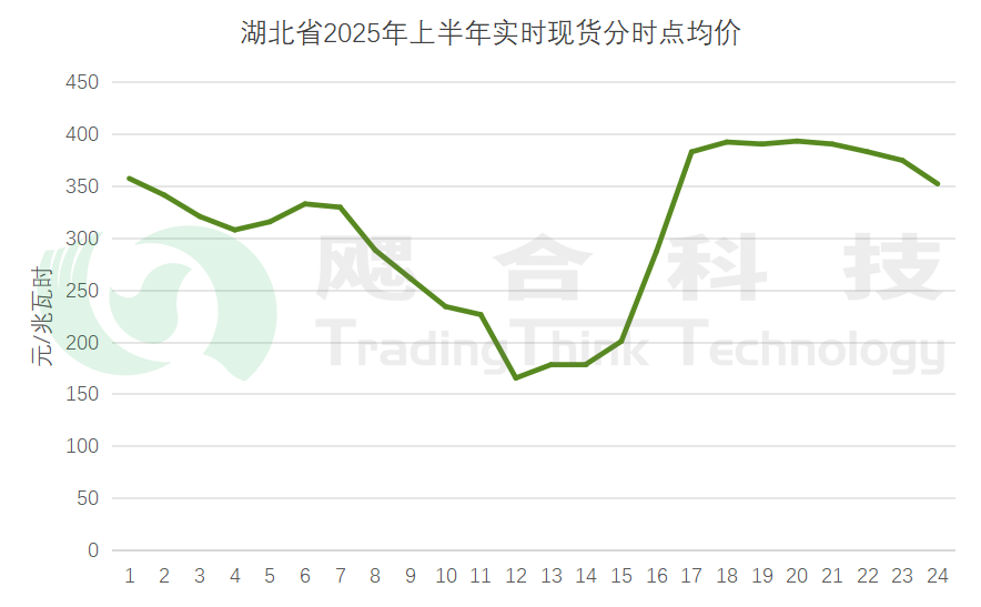 2025年1-6月實時現(xiàn)貨均價308.07元/兆瓦時,其中12時點電價最低,為165.73元/兆瓦時,19時點電價最高,為393.65元/兆瓦時。1-6月實時價格最低為6月242.86元/兆瓦時,最高為2月354.30元/兆瓦時。