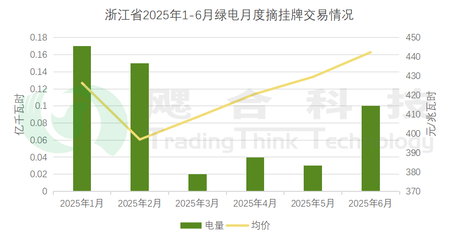2025年1-6月,浙江省綠電月度雙邊協(xié)商共計成交電量39.5億千瓦時,均價398.16元/兆瓦時,綠電月度摘掛牌共計成交電量0.52億千瓦時,均價419.88元/兆瓦時。
