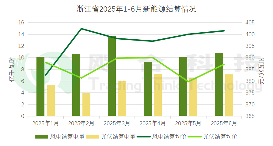 2025年1-6月,浙江省風電結(jié)算電量64.85億千瓦時,結(jié)算均價397.13元/兆瓦時;光伏結(jié)算電量36.2億千瓦時,結(jié)算均價386.33元/兆瓦時。