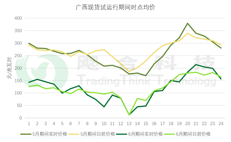 2025年5月10-19日、6月29-30日廣西開展現(xiàn)貨結(jié)算試運行,兩次現(xiàn)貨日前均價分別為217.19元/兆瓦時、120.34元/兆瓦時;實時均價分別為260.39元/兆瓦時、119.98元/兆瓦時。