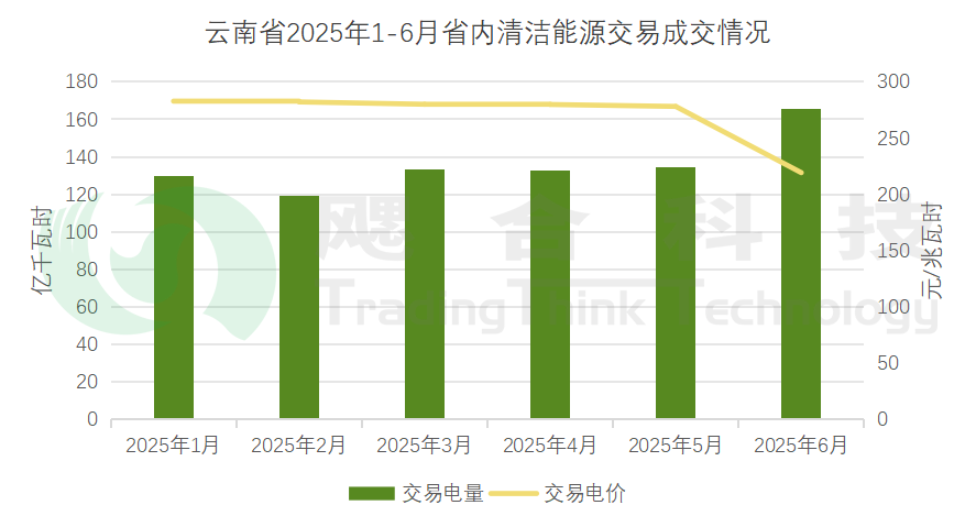 2025年1-6月云南省共計46家市場主體參與綠電交易市場申報(發(fā)電企業(yè)29家,售電公司17家),市場申報電量3.60億千瓦時。市場出清后,共計46家市場主體成交電量3.60億千瓦時,電能量價格成交均價266.17 元/兆瓦時,綠證價格成交均價10.74 元/千瓦時。