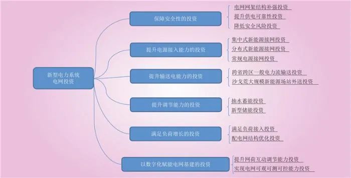 為實(shí)現(xiàn)“雙碳”目標(biāo),電力系統(tǒng)各環(huán)節(jié)形態(tài)發(fā)生顯著變化,電網(wǎng)是能源轉(zhuǎn)型的中心環(huán)節(jié)和新型電力系統(tǒng)的基礎(chǔ)平臺(tái),電網(wǎng)基建的投資功能面臨著提升新型電力系統(tǒng)電源接入能力、提升系統(tǒng)輸送電能力、提升系統(tǒng)調(diào)節(jié)能力、滿足系統(tǒng)負(fù)荷增長以及提升系統(tǒng)數(shù)字化水平等方面新的要求,電網(wǎng)基建的功能化投資需求體系如圖1所示。