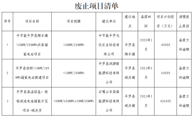 石嘴山市平羅縣審批服務(wù)管理局關(guān)于廢止一批新型儲(chǔ)能項(xiàng)目的公告