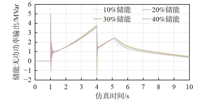 如圖1所示,與工況(1)情況近似,當負荷端變化時,系統(tǒng)電壓發(fā)生短暫過載并在發(fā)電端調節(jié)后趨于穩(wěn)定。除40%儲能外,在發(fā)電端完成調節(jié)之前,電壓過載率均高于20%。如圖2所示,與工況(1)相比,儲能無功輸出更低。