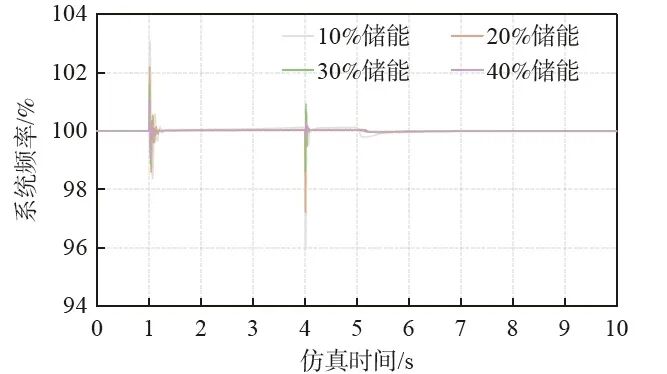下圖表明,20%以上儲能情況下,系統(tǒng)頻率波動不明顯,在系統(tǒng)完成調節(jié)后頻率穩(wěn)定,變化范圍<1%。