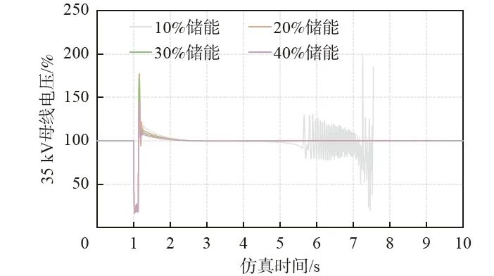 下圖為仿真工況(3)35千伏母線電壓在不同儲能配比情況下的仿真結果。風機高壓側母線單相故障在排除前帶來了很大的電壓波動,小于20%儲能的情況下無法使得系統(tǒng)電壓穩(wěn)定,系統(tǒng)電壓在故障排除后產生了震蕩現象,儲能組件無法通過無功功率調節(jié)平抑波動。20%及以上的儲能配置可以平穩(wěn)電壓,區(qū)別在于在故障排除后導致的電壓波動峰值。