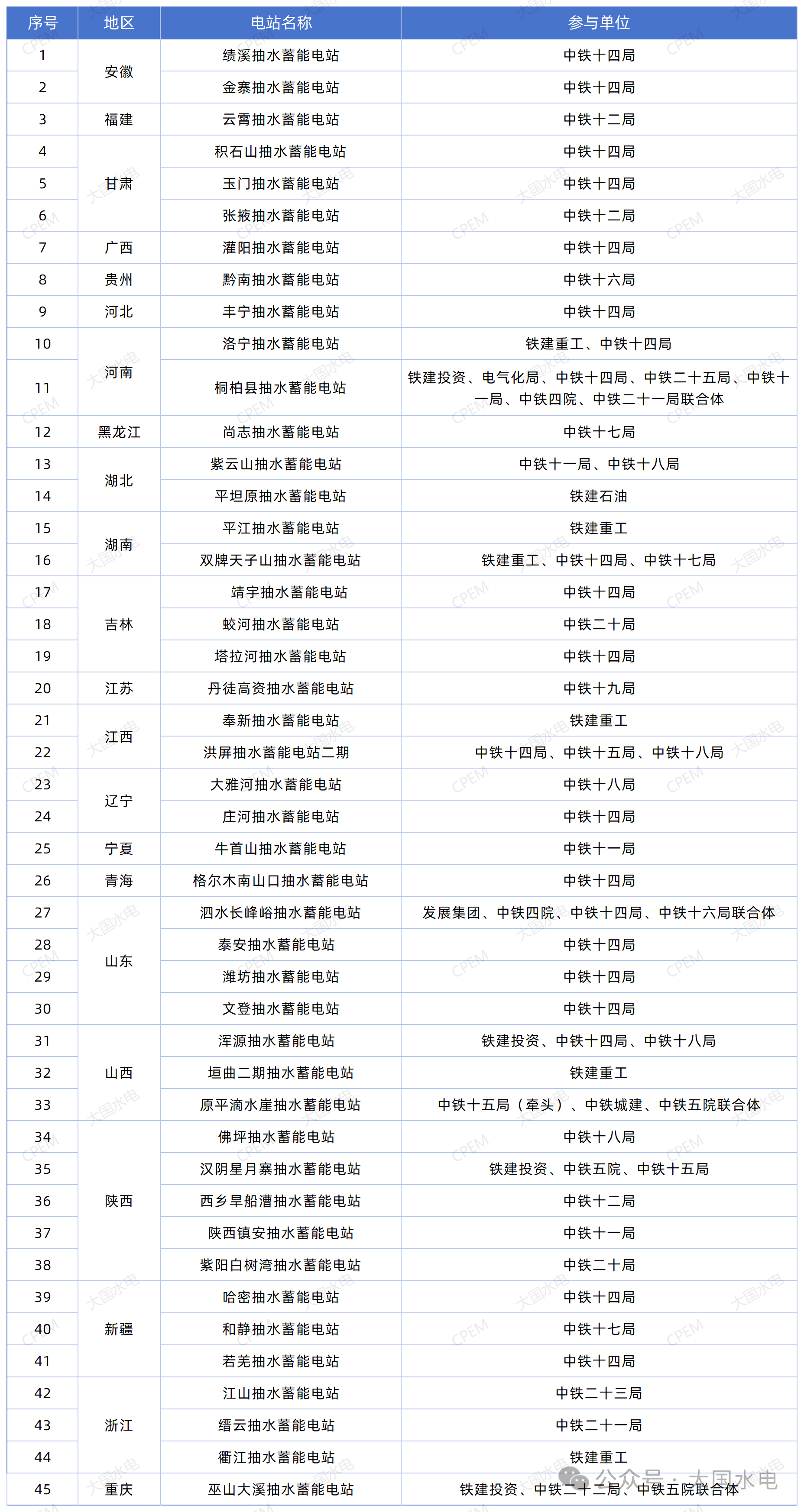 2023年后,中國(guó)鐵建在抽水蓄能領(lǐng)域進(jìn)入快速發(fā)展期,參與多個(gè)國(guó)家級(jí)重點(diǎn)工程。據(jù)CPEM、大國(guó)水電不完全統(tǒng)計(jì),中國(guó)鐵建參與的抽水蓄能項(xiàng)目遍布了全國(guó)20多個(gè)省份,總計(jì)約45個(gè),如下: