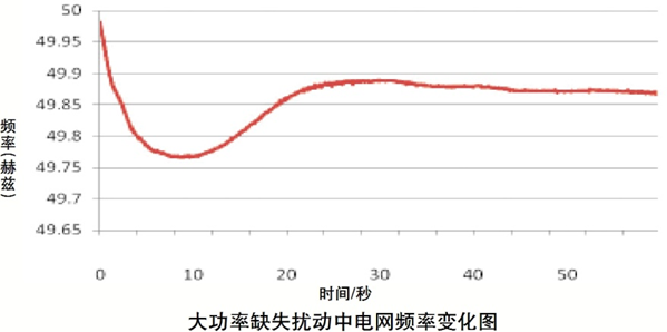 按照《電力輔助服務管理辦法》中的定義,轉動慣量輔助服務是指在系統(tǒng)經受擾動時,并網主體根據自身慣量特性為系統(tǒng)提供響應系統(tǒng)頻率變化率的快速正阻尼,以阻止系統(tǒng)頻率突變所提供的服務。從運行上分析,在發(fā)生大功率缺失擾動事件時,系統(tǒng)有功功率出現(xiàn)不平衡,導致頻率發(fā)生變化,此時機組轉動慣量通過釋放動能來減小頻率變化幅度和變化速度,為一次調頻和AGC(自動發(fā)電控制)調頻動作爭取響應時間。在缺少足額轉動慣量的情況下,有可能等不到一次調頻和AGC調頻動作,系統(tǒng)頻率就直接跌破低頻減載設定值,從而導致事故進一步擴大。可見,轉動慣量本質上是由機組轉動部件提供動能來彌補系統(tǒng)缺失的有功功率,如果能夠即時通過增量有功功率直接彌補缺失的有功功率,就可以起到與轉動慣量相同的功效,這就是電化學儲能等電源能夠提供轉動慣量輔助服務的物理解釋。在大擾動事件中,轉動慣量的作用有兩個:一是減小頻率跌落速度和斜率,二是提高頻率跌落最低值。