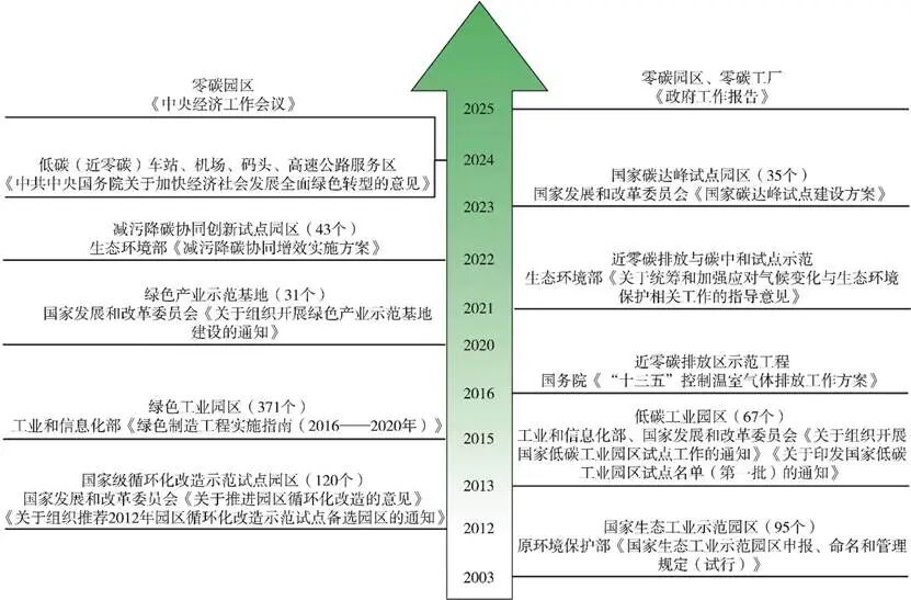 在政策層面,園區(qū)零碳發(fā)展政策經(jīng)歷了從“早期探索—孕育發(fā)展—全面深化”的階段性演進(jìn)過(guò)程(圖1)。在早期探索階段,國(guó)家相關(guān)部委主要從某個(gè)角度或者領(lǐng)域出發(fā),先后推進(jìn)生態(tài)工業(yè)示范園區(qū)、循環(huán)化改造示范園區(qū)、低碳工業(yè)園區(qū)、綠色工業(yè)園區(qū)和綠色產(chǎn)業(yè)示范基地等多類試點(diǎn)項(xiàng)目。其中,生態(tài)工業(yè)園區(qū)與循環(huán)化改造園區(qū)以循環(huán)經(jīng)濟(jì)理念推動(dòng)產(chǎn)業(yè)鏈綠色改造,低碳工業(yè)園區(qū)聚焦重點(diǎn)用能行業(yè)的低碳轉(zhuǎn)型,而綠色工業(yè)園區(qū)和綠色產(chǎn)業(yè)示范基地則突出綠色制造理念。這些試點(diǎn)在生態(tài)保護(hù)、資源循環(huán)利用、低碳轉(zhuǎn)型、綠色制造等方面積累了經(jīng)驗(yàn),為后續(xù)推進(jìn)系統(tǒng)性治理奠定了重要基礎(chǔ)。