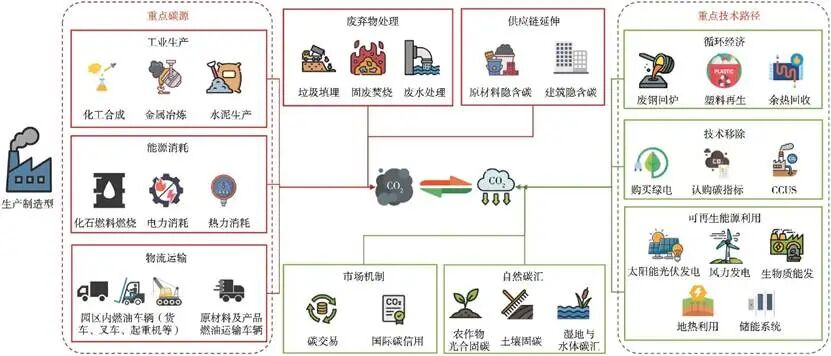 生產(chǎn)制造型園區(qū)通常以高耗能制造業(yè)為主導(dǎo),園區(qū)內(nèi)多為工廠廠房和生產(chǎn)設(shè)施。如圖3所示,其碳排放主要來(lái)自工業(yè)生產(chǎn)環(huán)節(jié)(如化工合成、金屬冶煉、水泥生產(chǎn)等,范圍1)、能源消耗環(huán)節(jié)(如煤炭、天然氣等燃料燃燒和電力、熱力使用,范圍1和2),以及物流運(yùn)輸環(huán)節(jié)(如園區(qū)外燃油運(yùn)輸車輛等,范圍3)。此類園區(qū)應(yīng)聚焦如下降碳路徑:在物質(zhì)流方面,推廣廢鋼回爐、塑料再生、余熱回收等閉環(huán)工藝,降低原生資源依賴,推動(dòng)資源循環(huán)利用。能源側(cè)推動(dòng)太陽(yáng)能光伏、風(fēng)能、生物質(zhì)和地?zé)岬瓤稍偕茉刺娲鷤鹘y(tǒng)化石燃料,并配套構(gòu)建多能源融合系統(tǒng),以兼顧能源結(jié)構(gòu)優(yōu)化和設(shè)備集成共享。對(duì)于其他技術(shù)手段仍難以消除的剩余排放,可以通過(guò)購(gòu)買綠電、認(rèn)購(gòu)碳指標(biāo)、探索CCUS等方式消除。