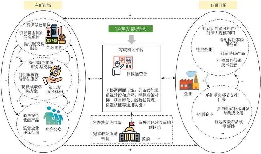 右側(cè)的理念實(shí)現(xiàn)市場(chǎng)由鏈主企業(yè)與鏈輔企業(yè)構(gòu)成。鏈主企業(yè)具備資源集聚與系統(tǒng)轉(zhuǎn)型能力,是園區(qū)綠色低碳能源替代、低碳制造升級(jí)與綠色供應(yīng)鏈重塑的主導(dǎo)力量,其回報(bào)體現(xiàn)為政策激勵(lì)、市場(chǎng)占有率提升與品牌聲譽(yù)增強(qiáng)。鏈輔企業(yè)則在零碳技術(shù)研發(fā)、零碳產(chǎn)品(零部件)供給和專業(yè)化配套方面發(fā)揮靈活性優(yōu)勢(shì),增強(qiáng)園區(qū)綠色供給的多樣性與適應(yīng)性,進(jìn)而獲得技術(shù)溢出效應(yīng)與新興市場(chǎng)空間。在企業(yè)間協(xié)作方面,鏈主企業(yè)通過(guò)共建產(chǎn)業(yè)聯(lián)盟、聯(lián)合技術(shù)攻關(guān)形成協(xié)同引領(lǐng)格局;鏈輔企業(yè)之間則通過(guò)共享設(shè)施、互補(bǔ)技術(shù)與聯(lián)合采購(gòu)提升資源配置效率;鏈主企業(yè)與鏈輔企業(yè)之間通過(guò)標(biāo)準(zhǔn)聯(lián)動(dòng)與產(chǎn)業(yè)鏈協(xié)同推動(dòng)減排責(zé)任共擔(dān)與創(chuàng)新成果轉(zhuǎn)化,最終構(gòu)建出一個(gè)互嵌互動(dòng)、共生共贏的零碳產(chǎn)業(yè)生態(tài)網(wǎng)絡(luò)。