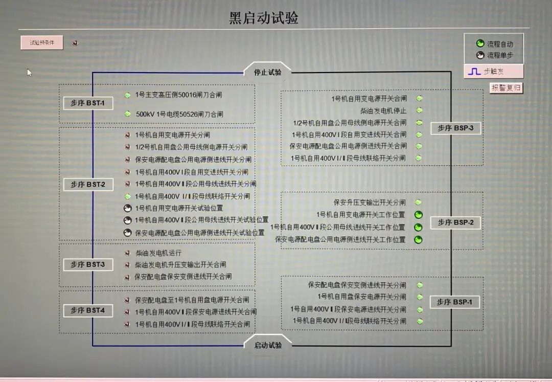 通過(guò)對(duì)原有黑啟動(dòng)設(shè)備的整合、升級(jí)和改造,徹底完成了黑啟動(dòng)設(shè)備自動(dòng)化的更新?lián)Q代,并集成了所有順控流程于上位機(jī)監(jiān)控電腦,目前該套系統(tǒng)已經(jīng)在桐柏電站投入使用,多次試驗(yàn)證明其操作簡(jiǎn)單、安全可靠,黑啟動(dòng)全程僅需10分鐘即可,比人工操作至少節(jié)省50分鐘,且可以通過(guò)監(jiān)控畫面全面把控黑啟動(dòng)進(jìn)程。