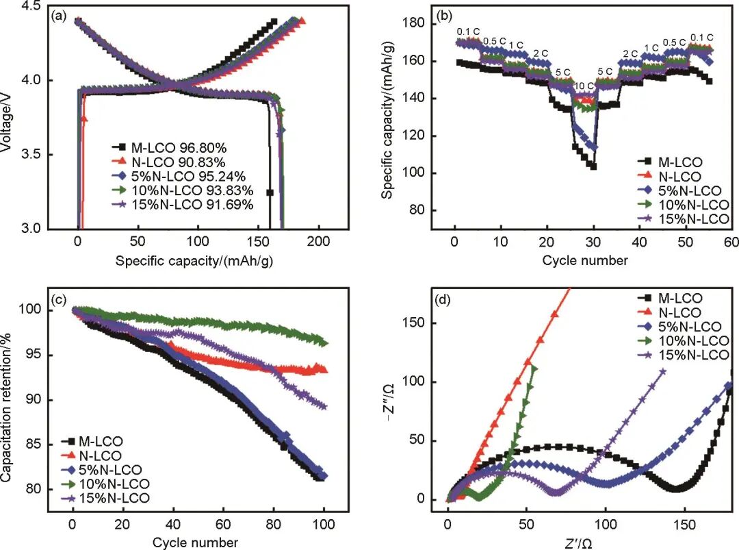 圖3 M-LCO、N-LCO及x%N-LCO材料的電化學(xué)性能 (a) 首次庫侖效率;(b) 倍率性能;(c) 1 C充放電循環(huán)性能;(d) 電化學(xué)阻抗譜圖