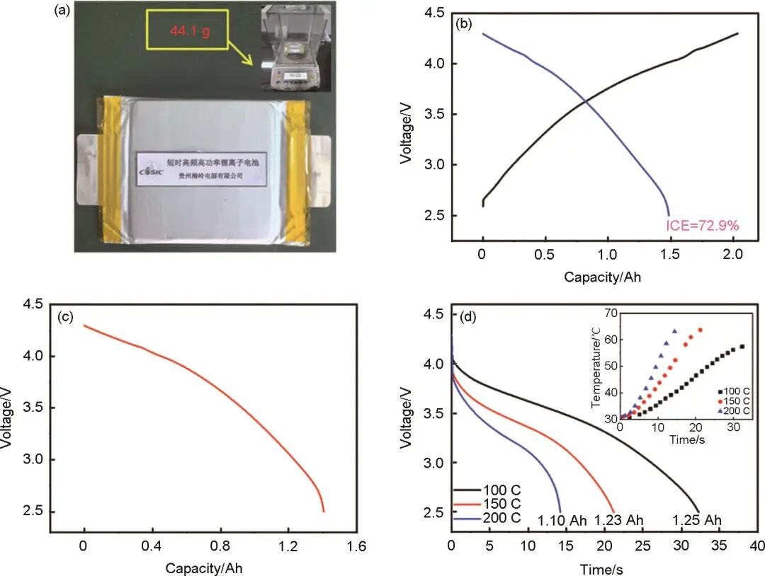 圖4 HC//10%N-LCO軟包電池的 (a) 實物照片;(b) 0.2 C首次充放電曲線;(c) 1 C放電曲線;(d) 100~200 C倍率放電曲線 (插圖是電池表面溫度的變化)