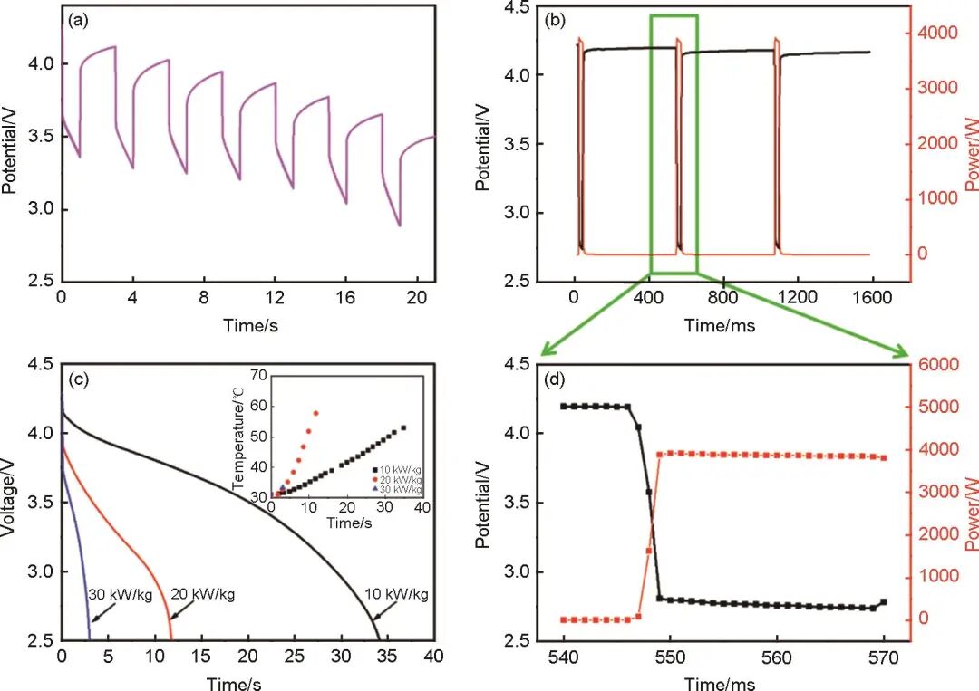 HC//10%N-LCO軟包電池在350 C倍率(500 A電流)下的1 s脈沖放電曲線如圖5(a)所示,在經(jīng)歷7次脈沖放電后,電池的放電終止電壓依然大于放電截止電壓2.5 V。隨后,對其進行了1000 C毫秒級脈沖放電,如圖5(b)、(d)所示,在整個20 ms脈沖放電周期內(nèi),電池的放電功率都可維持在3900 W左右,結(jié)合電池單體質(zhì)量為44.1 g,其脈沖功率為88.44 kW/kg??梢钥闯?,HC//10%N-LCO軟包電池具有極其優(yōu)異的脈沖放電能力。這是因為在納/微結(jié)構(gòu)鈷酸鋰顆粒級配正電極中,納米顆粒填充至微米顆粒之間,能夠降低電極的迂曲度,改善電解液浸潤性,而微米級顆粒作為“導(dǎo)電骨架”,減小了納米顆粒間的接觸電阻,從而加快了電極的離子/電子傳輸,極大地提升了電池的功率性能。為了進一步評估電池在特定功率輸出下的性能表現(xiàn),對HC//10%N-LCO軟包電池進行了10 kW/kg、20 kW/kg和30 kW/kg恒功率放電[圖5(c)],持續(xù)放電功率分別為440 W、880 W和1320 W,可以看出,在上述功率條件下,電池分別可以持續(xù)放電34.1 s、11.9 s和3.1 s,具有優(yōu)異的功率輸出能力。在進行恒功率放電的同時,對軟包電池的表面在自然散熱的情況下進行了監(jiān)測(環(huán)境溫度30 ℃),如圖5(d)中的插圖所示。在10 kW/kg、20 kW/kg和30 kW/kg放電結(jié)束時電池表面的溫度分別為52.9 ℃、57.7 ℃和33.4 ℃(溫升<30 ℃),溫升較大倍率恒流放電時更低。30 kW/kg恒功率放電時的溫升小于5 ℃,這是因為在此功率密度下放電時間只有3.1 s,電池內(nèi)部還沒有熱量積累。