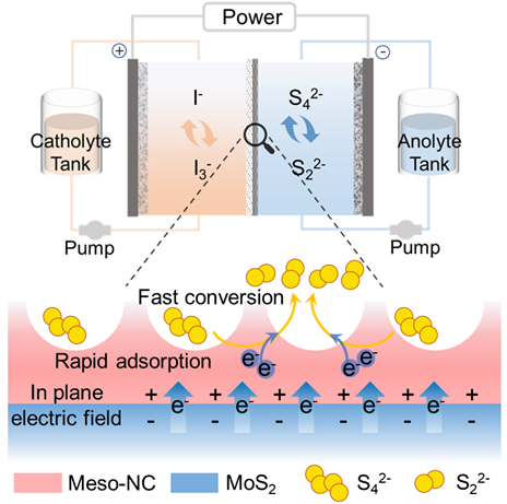 基于此,陳嘉嘉教授課題組設(shè)計出一種具有三明治狀納米結(jié)構(gòu)的二維有序介孔氮摻雜碳復(fù)合二硫化鉬(Meso-NC@MoS2)異質(zhì)結(jié),以促進(jìn)多硫化物的吸附并加速其緩慢的動力學(xué)。理論計算證實,MoS2和Meso-NC之間建立的定向電子傳輸通道加速了電子從Meso-NC@MoS2向S42-的轉(zhuǎn)移,有效促進(jìn)S42-解離并形成低階多硫化物。基礎(chǔ)電化學(xué)測試表明,在Meso-NC@MoS2電極上,水系多硫化物展現(xiàn)出最大反應(yīng)動力學(xué)活性(反應(yīng)速率常數(shù)提升3.2倍)與最小峰電位差(ΔEp降低至0.21 V),突顯了卓越的催化活性與反應(yīng)可逆性。相較于純碳?xì)蛛姌O,基于Meso-NC@MoS2的水系多硫化物液流電池充電過電位顯著降低約377 mV,并有效削弱電池極化。該電池在30天內(nèi)連續(xù)運行3200次循環(huán)后,仍保持112 mW cm-2的峰值功率密度及99.9%的庫倫效率。