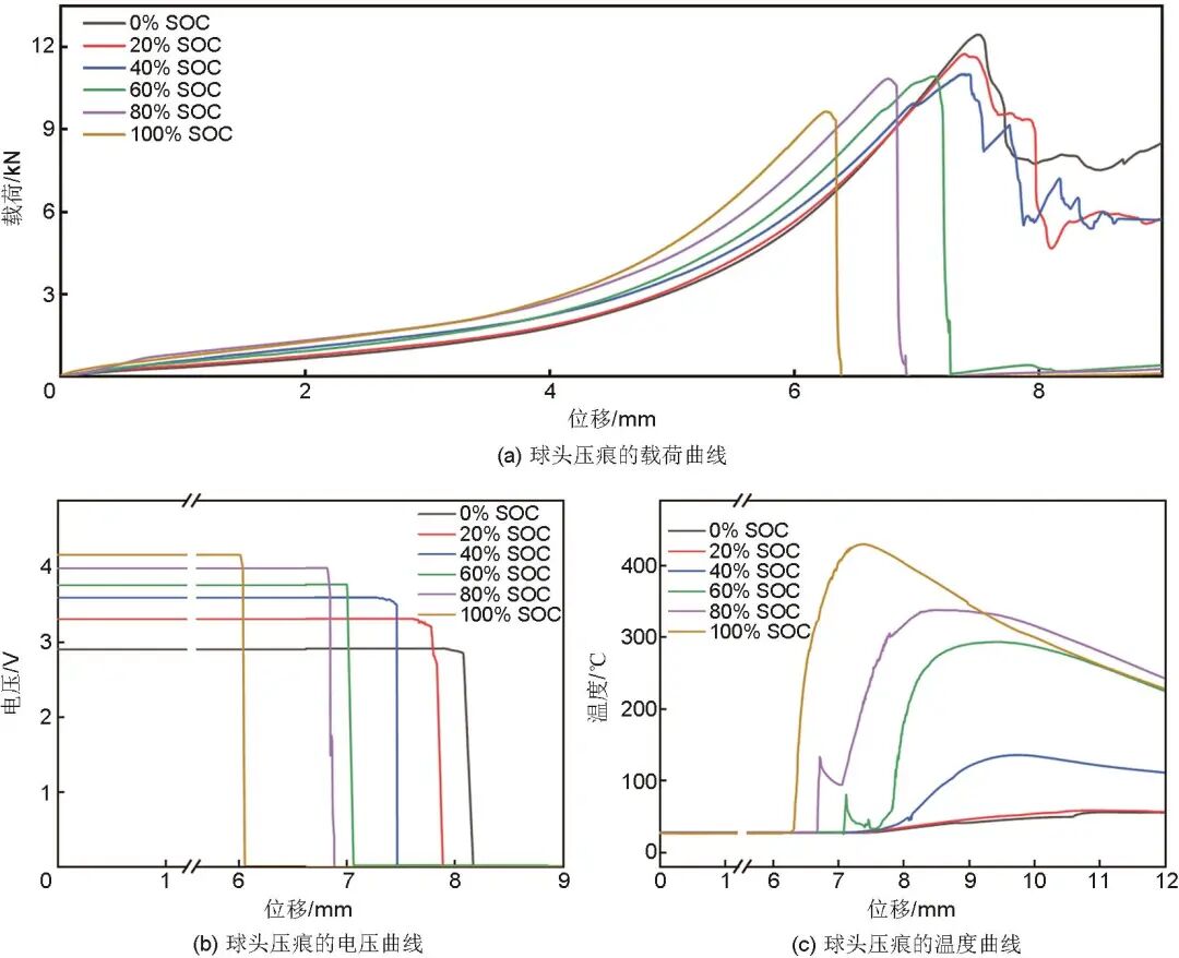 為明確球壓過(guò)程中的各個(gè)階段及相應(yīng)的特征,探究全域機(jī)械負(fù)載下的圓柱型電池力-電-熱耦合響應(yīng),確定電池在不同SOC下的球頭壓痕特性。圖3(a)為不同SOC電池球頭壓痕實(shí)驗(yàn)電壓及載荷變化數(shù)據(jù),可見(jiàn)壓縮深度為0~4 mm時(shí),載荷緩慢上升,電芯在4 mm壓縮深度時(shí)被壓實(shí),4 mm壓縮深度后,載荷急速上升,達(dá)到峰值載荷后發(fā)生內(nèi)短路現(xiàn)象。未熱失控電池載荷驟降至5~8 kN,熱失控電池載荷驟降至0 N。0% SOC電池的內(nèi)短路壓痕位移為7.50 mm,100% SOC電池的壓痕位移為6.26 mm,表明SOC越高,電池越容易發(fā)生內(nèi)短路。峰值載荷值隨著SOC的增大而減小,0% SOC電池的峰值載荷為12.41 kN,100% SOC電池為9.62 kN。這是因?yàn)榍蝾^壓痕實(shí)驗(yàn)在電池的局部位置施加載荷,極片和隔膜受到軸向和縱向雙重壓力(圖1),鋰離子嵌入負(fù)極形成穩(wěn)定結(jié)構(gòu),對(duì)徑向受力起“抵抗”作用,電極軸向受力使得電池出現(xiàn)剪切力破壞導(dǎo)致隔膜的損壞,進(jìn)而引發(fā)電芯電極出現(xiàn)斷裂帶,誘發(fā)了更劇烈的內(nèi)短路行為,產(chǎn)生局部短路電流。短路電流通過(guò)極耳從初始的電極對(duì)傳輸?shù)蕉搪冯姌O對(duì)形成回路,電池短路帶呈現(xiàn)兩端蔓延現(xiàn)象。