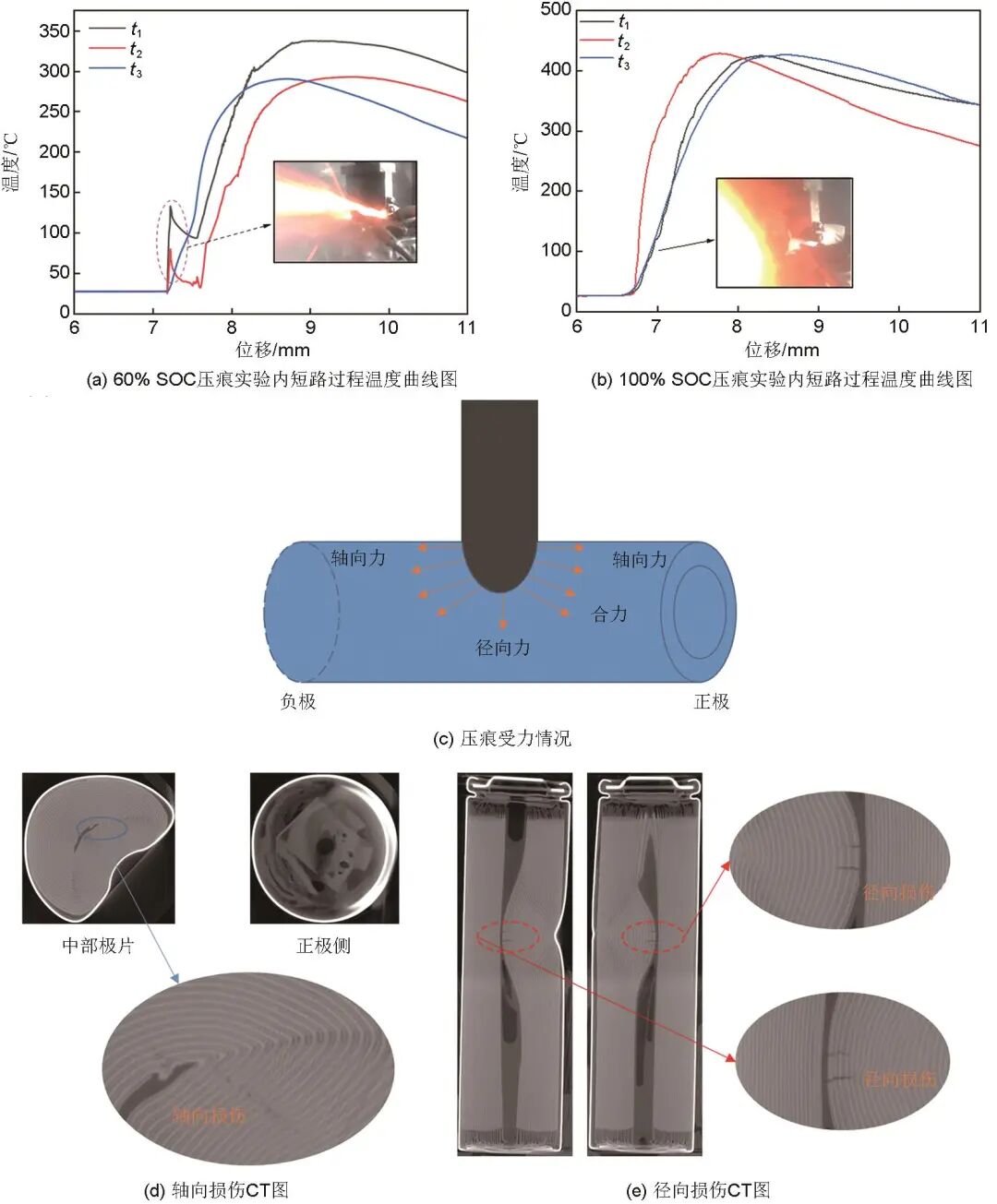 如圖5(c)所示,在球頭壓痕試驗(yàn)中,球頭施加到電池表面的載荷方向與接觸面垂直。隨著壓痕深度的增加,電芯受到徑向與軸向的壓力,兩種不同的作用力對(duì)極片的破壞形式不同,徑向力對(duì)極片與隔膜強(qiáng)度產(chǎn)生破壞,軸向力主要對(duì)電極產(chǎn)生剪切破壞,兩種力同時(shí)對(duì)電池產(chǎn)生作用效果。從圖5(d)中可知,內(nèi)短路發(fā)生前期,中部極片出現(xiàn)層間裂紋,安全閥出現(xiàn)結(jié)構(gòu)性破壞,被壓兩側(cè)均有極片裂紋,局部電極破壞形式較多,內(nèi)短路發(fā)生后溫度驟升??傮w來(lái)說(shuō),在初始?jí)汉圻^(guò)程中,電池內(nèi)部結(jié)構(gòu)由于擠壓產(chǎn)生較大壓力,內(nèi)部氣壓在正極側(cè)、中部、負(fù)極側(cè)大量積聚至內(nèi)短路產(chǎn)生。電池正負(fù)極處均出現(xiàn)破裂,極片和隔膜從正負(fù)極位置向外突出,中部壓痕區(qū)域?qū)娱g破壞顯著,銅箔、鋁箔形貌均遭受較大損壞,出現(xiàn)局部屈曲彎折變形。斷裂帶沿著縱向擴(kuò)展的深度有限,且某些位置的極片排列較為齊整。由此可見(jiàn),壓痕引起的熱失控是局部?jī)?nèi)短路擴(kuò)展蔓延的結(jié)果。