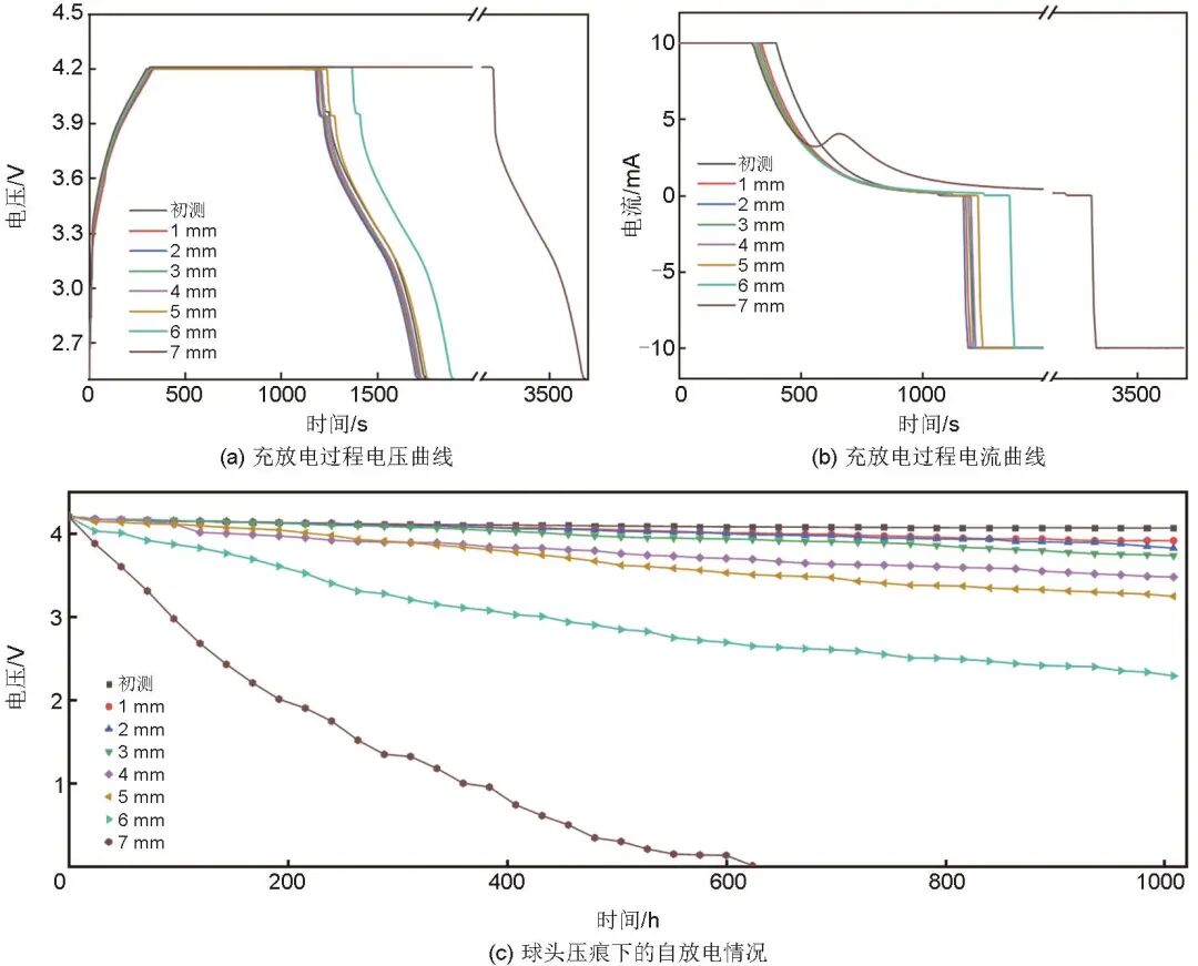 (4)壓痕狀態(tài)下的電化學(xué)性質(zhì)探究中,雖然不同壓痕深度電池恒流充電容量近乎相同,但恒流放電容量隨著壓痕深度增加而逐漸降低。在壓痕深度為5 mm之前,容量衰減趨勢(shì)接近線性,超過(guò)6 mm之后大幅下降,這是因?yàn)楦嗟亩搪冯姌O對(duì)影響電池容量。
