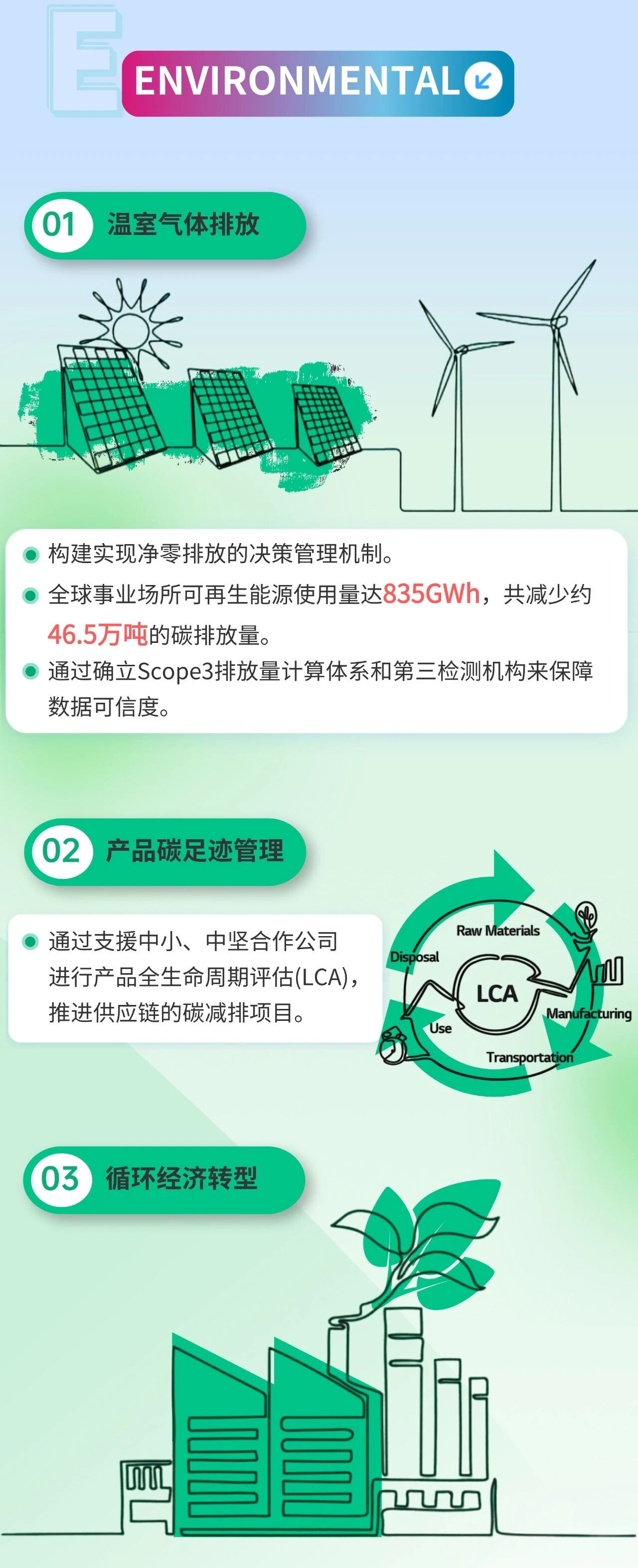 當(dāng)前,全球生態(tài)環(huán)境與治理面臨嚴(yán)峻考驗(yàn),可持續(xù)已成為世界共同發(fā)展的核心議題。LG化學(xué)積極應(yīng)對氣候變化挑戰(zhàn)和新時(shí)代變革,將可持續(xù)發(fā)展與各業(yè)務(wù)領(lǐng)域深度融合,以實(shí)際行動踐行可持續(xù)經(jīng)營理念、夯實(shí)可持續(xù)發(fā)展韌性并履行企業(yè)社會責(zé)任。