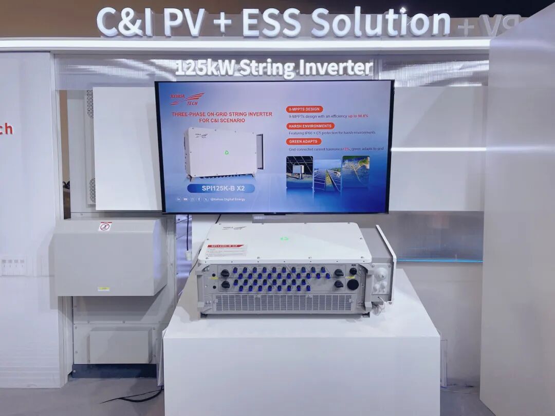 在光伏方面,科華數(shù)能本次重點展示了125kW組串式逆變器。該產(chǎn)品單路MPPT最高支持75A,配備直流/交流端子溫度智能監(jiān)測與自動化PV側(cè)停機(jī)功能,可選IV曲線分析與故障波形記錄,助力快速定位問題、預(yù)防維護(hù)。產(chǎn)品最高效率達(dá)98.8%,具備IP66+C5防護(hù)與低諧波并網(wǎng)表現(xiàn),可在寬溫環(huán)境下穩(wěn)定輸出。
