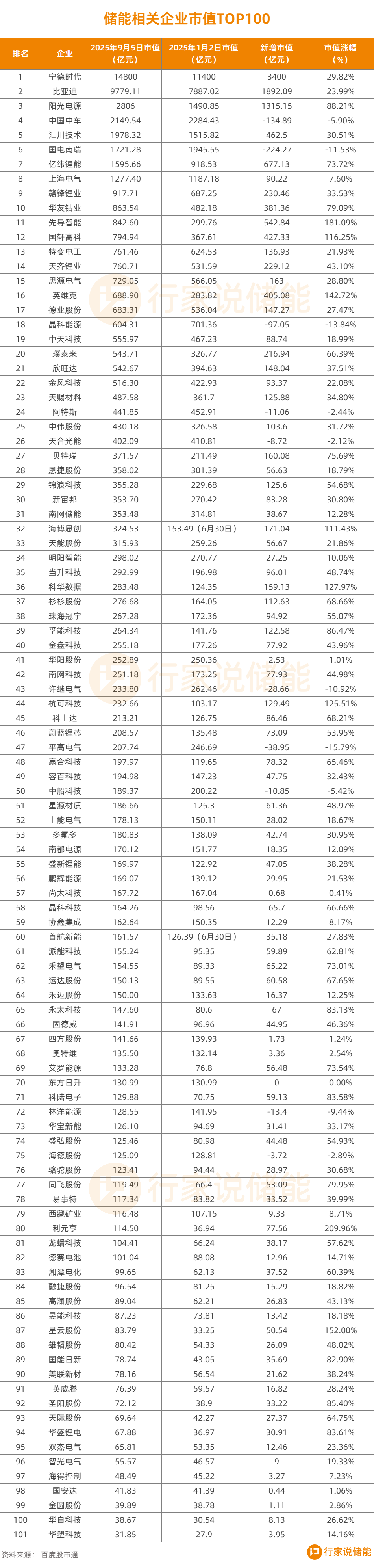 中國儲能網(wǎng)訊:據(jù)行家說儲能統(tǒng)計,儲能相關(guān)企業(yè)TOP100+總市值達60112億元。