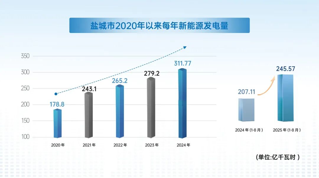 截至今年8月底,鹽城新能源年發(fā)電量已達(dá)245.5億千瓦時(shí),預(yù)計(jì)今年鹽城新能源全年發(fā)電量將突破400億千瓦時(shí)。按照全國(guó)每人每年平均用電1000千瓦時(shí)測(cè)算,鹽城新能源全年發(fā)電量相當(dāng)于4000萬(wàn)人一年的用電量,與越南全國(guó)新能源(不包括水電)發(fā)電水平相當(dāng)。