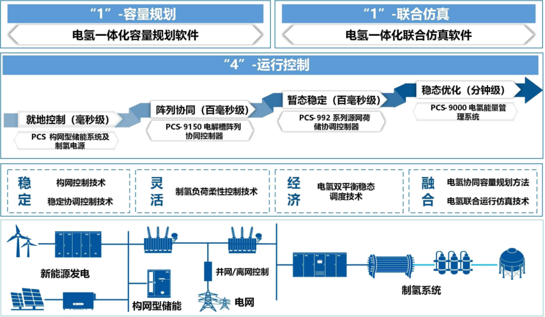 針對新能源制氫在離網(wǎng)及并離網(wǎng)場景下面臨的經(jīng)濟(jì)性、穩(wěn)定性和靈活性運(yùn)行難題,南瑞繼保創(chuàng)新提出“1+1+4”電氫一體化控制體系,并研制了PCS新能源電氫協(xié)同一體化控制系統(tǒng)的全系列自主可控產(chǎn)品。該系統(tǒng)依托構(gòu)網(wǎng)控制技術(shù)構(gòu)建電壓支撐體系,運(yùn)用制氫負(fù)荷柔性控制技術(shù)提升電解槽集群的安全運(yùn)行與靈活調(diào)節(jié)能力;通過穩(wěn)定協(xié)調(diào)控制與電氫雙平衡穩(wěn)態(tài)調(diào)度技術(shù),實(shí)現(xiàn)電氫源荷互動,顯著增強(qiáng)了系統(tǒng)暫態(tài)穩(wěn)定性與長周期經(jīng)濟(jì)性。項(xiàng)目開發(fā)的電氫容量規(guī)劃軟件及聯(lián)合仿真系統(tǒng),支撐了電氫系統(tǒng)的深度融合,全面保障其在全生命周期內(nèi)的高經(jīng)濟(jì)性與高可靠性。