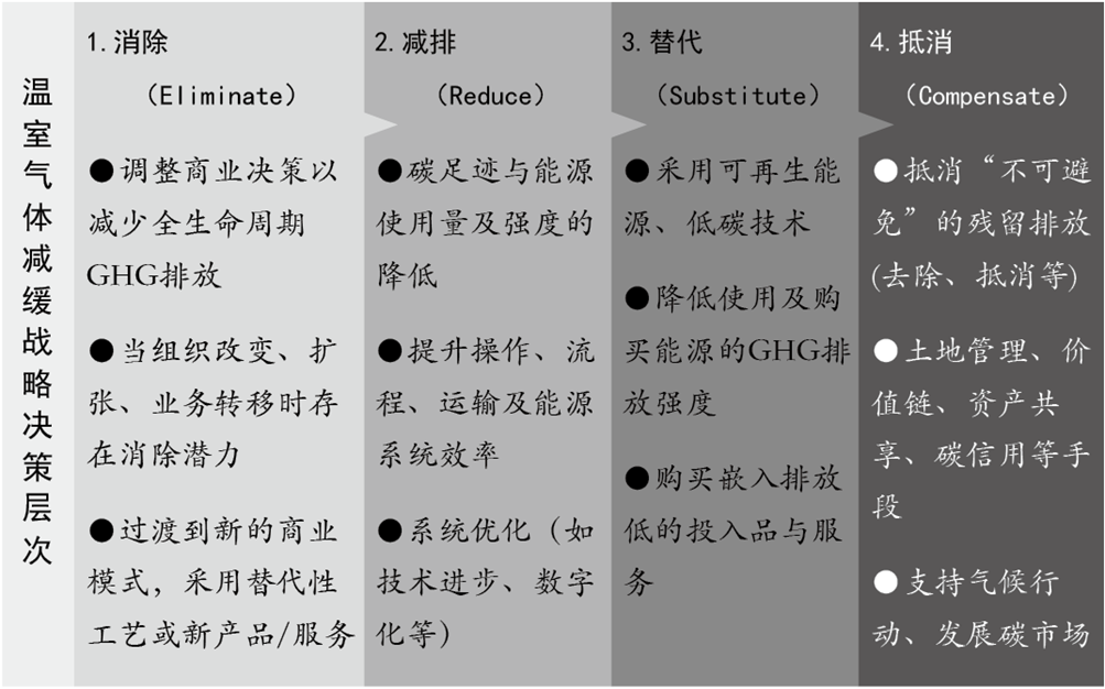 在制定零碳路線圖(Decarbonization Roadmap)方面,國際環(huán)境管理與評價(jià)協(xié)會(huì)(IEMA)提出的排放減緩/減少的層次分析結(jié)構(gòu),可指導(dǎo)產(chǎn)業(yè)、園區(qū)以及利益相關(guān)者制定脫碳戰(zhàn)略。這為決策者提供了一種結(jié)構(gòu)化的分析與評估方法,可綜合考慮脫碳目的、預(yù)算、風(fēng)險(xiǎn)與場地限制等因素。