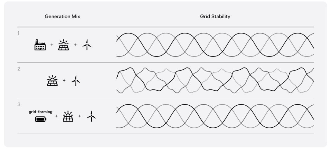 構(gòu)網(wǎng)對電網(wǎng)穩(wěn)定性的貢獻(xiàn)很像汽車的減震器——它能抑制波動并保持平穩(wěn)運行,即使在擾動期間也是如此。正如沒有減震器的車輛可能會失控一樣,沒有適當(dāng)阻尼的電網(wǎng)可能會經(jīng)歷停電。傳統(tǒng)上,基于化石燃料的同步發(fā)電機通過使用機械慣性和旋轉(zhuǎn)能量來穩(wěn)定電壓和頻率,從而執(zhí)行此構(gòu)網(wǎng)功能。構(gòu)網(wǎng)逆變器可以通過獨立建立和調(diào)節(jié)電網(wǎng)電壓和頻率,并亞周期響應(yīng)以抵消電網(wǎng)擾動,來實現(xiàn)相同的穩(wěn)定功能。