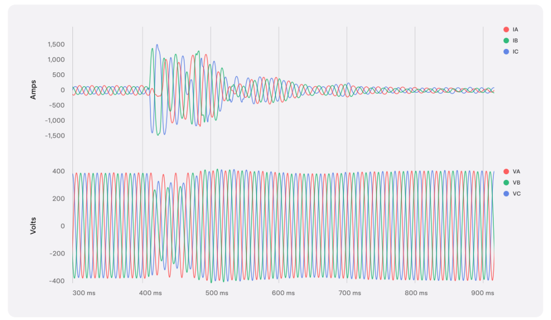 一些構(gòu)網(wǎng)逆變器能夠以驚人的速度響應(yīng)電壓擾動以抵消它們。與同步發(fā)電機類似但不同于電網(wǎng)跟隨逆變器,它們可以亞周期響應(yīng)電網(wǎng)擾動。下圖說明了這一點,圖中電網(wǎng)故障壓低了電壓的兩個相位(VB 和 VC),構(gòu)網(wǎng)逆變器立即提供校正電流以抵消電壓降。