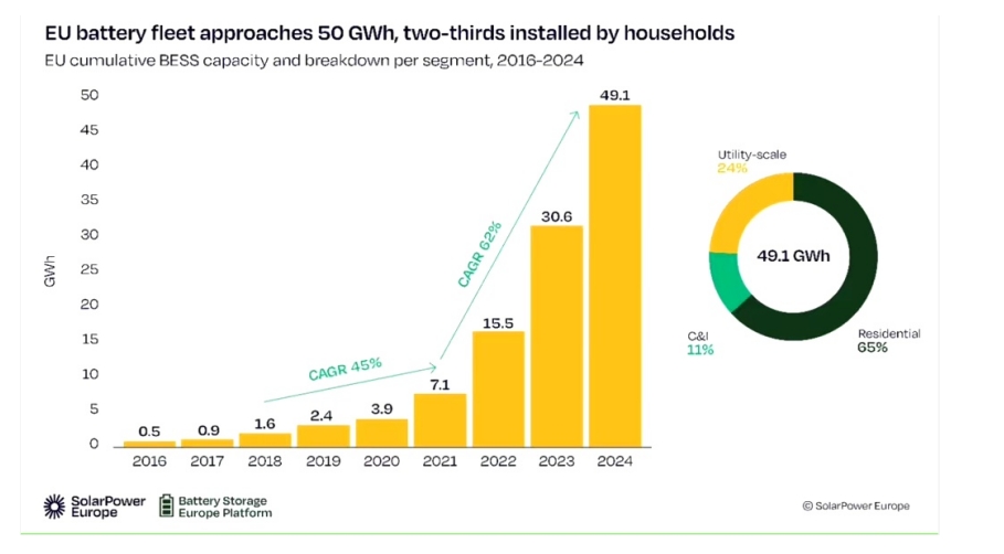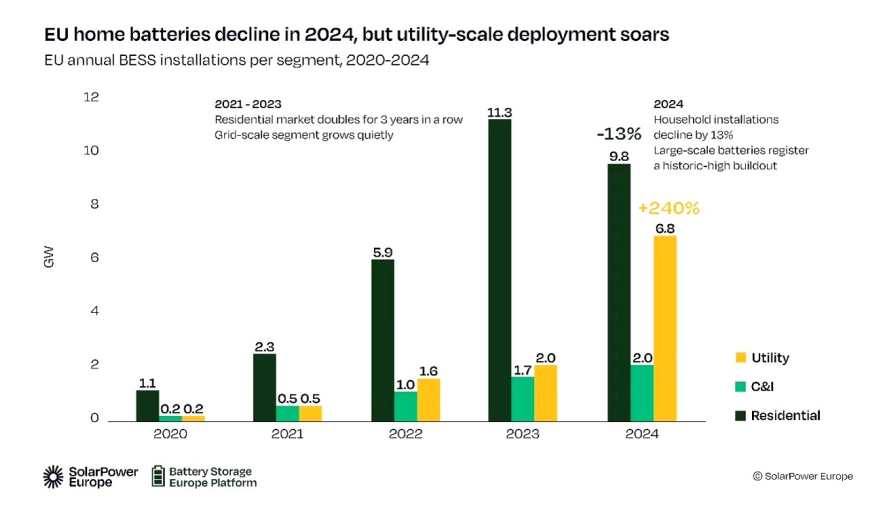 鑒于電價(jià)下降和家庭支持計(jì)劃逐步取消,2024年,住宅電池儲(chǔ)能系統(tǒng)市場出現(xiàn)了十年來的首次下滑(下降13%),盡管下滑幅度不大,但考慮到能源危機(jī)期間對其高增長的預(yù)期,這一情況還是在電池儲(chǔ)能行業(yè)引起了廣泛關(guān)注。不過,工商業(yè)電池儲(chǔ)能系統(tǒng)部署量仍在持續(xù)增長,但仍未充分發(fā)揮其潛力。