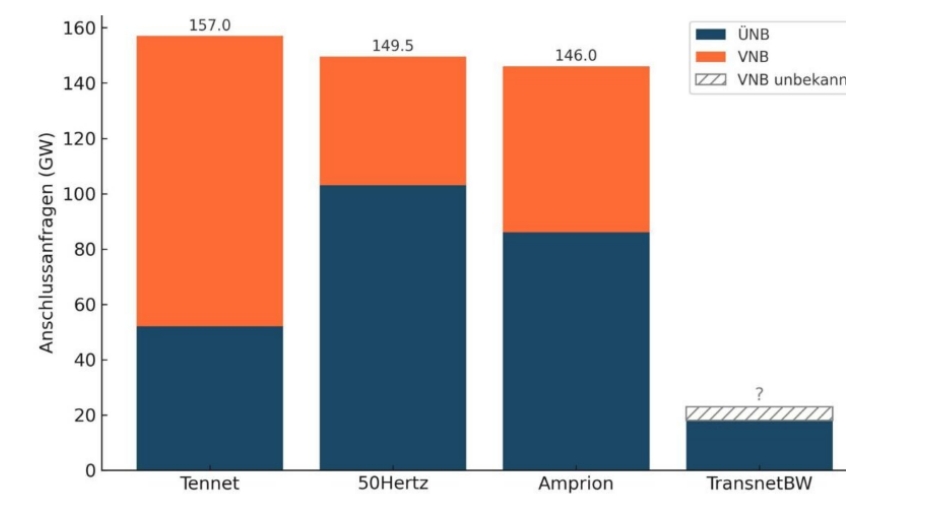 根據(jù)德國電力備用服務市場的統(tǒng)一交易機構Regelleistung-Online平臺的估算,德國四家輸電系統(tǒng)運營商和Edis、Westnetz和Mitnetz 這三家配電系統(tǒng)運營商的儲能系統(tǒng)申請并網(wǎng)的總裝機容量就已經(jīng)達到470.5GW,這意味著目前申請總量遠超500GW。