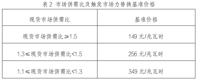 報(bào)價(jià)替換出清方面,供需比范圍內(nèi)將觸發(fā)市場(chǎng)力監(jiān)測(cè)的該類型電源高于基準(zhǔn)價(jià)格的報(bào)價(jià)段進(jìn)行替換,按替換后報(bào)價(jià)進(jìn)行日前及實(shí)時(shí)市場(chǎng)出清。替換價(jià)格暫定標(biāo)準(zhǔn)如表2所示,供需比范圍及對(duì)應(yīng)替換價(jià)格由政府相關(guān)部門進(jìn)行明確,后續(xù)進(jìn)行調(diào)整。當(dāng)同一類型電源連續(xù)5日未通過事前監(jiān)管時(shí),如第6日繼續(xù)未通過事前監(jiān)管,則從第6日起按替換基準(zhǔn)價(jià)格的0.95倍執(zhí)行,直至該類型電源通過事前監(jiān)管后恢復(fù)。