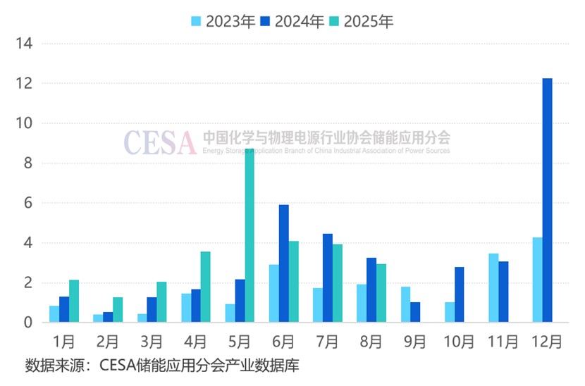 圖 2023-2025年8月中國新型儲能月度新增裝機(jī)