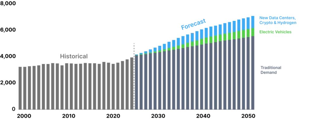 [圖表顯示歷史需求與2050年預(yù)測(cè)趨勢(shì),涵蓋數(shù)據(jù)中心、加密貨幣挖礦、氫能及電動(dòng)汽車的增量需求。來(lái)源:Orennia]