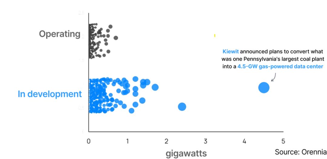 [數(shù)據(jù)點(diǎn)分布圖對(duì)比北美現(xiàn)有數(shù)據(jù)中心與在建項(xiàng)目的功率需求。來(lái)源:Orennia]