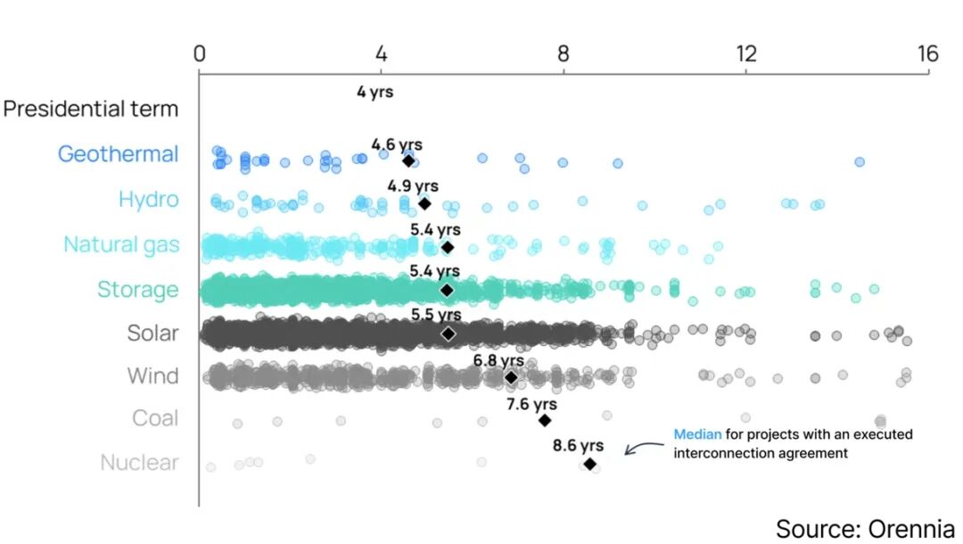 [按能源類型分類的并網(wǎng)隊(duì)列項(xiàng)目時(shí)長(zhǎng)分布圖。來(lái)源:Orennia]