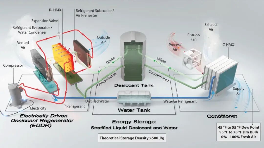 (系統(tǒng)示意圖說明:ESEAC系統(tǒng)包含三大創(chuàng)新子系統(tǒng):1)電動干燥劑再生器消耗系統(tǒng)90%以上電量,將稀釋干燥劑分離為蒸餾水和濃縮液體;2)儲能罐儲存分離后的液體;3)調(diào)節(jié)器使用儲存液體實(shí)現(xiàn)空氣干冷處理,僅需少量電力驅(qū)動泵和風(fēng)機(jī)。處理后干燥劑稀釋液返回儲罐。圖表由NREL喬舒亞·鮑爾制作)