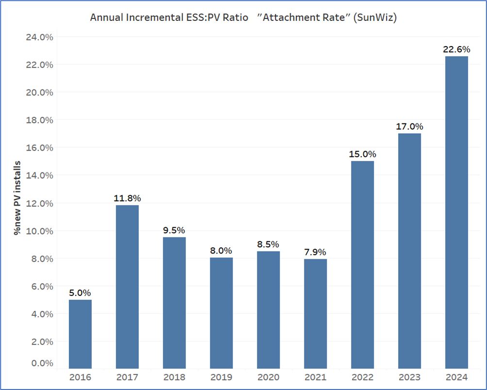 澳大利亞累計戶儲澳大利亞氣候變化與能源部官網(wǎng)顯示,每40戶家庭中只有1戶安裝了電池。而Sunwiz數(shù)據(jù)顯示,2024年只有22.6%新增的屋頂太陽能裝置安裝了配套電池。