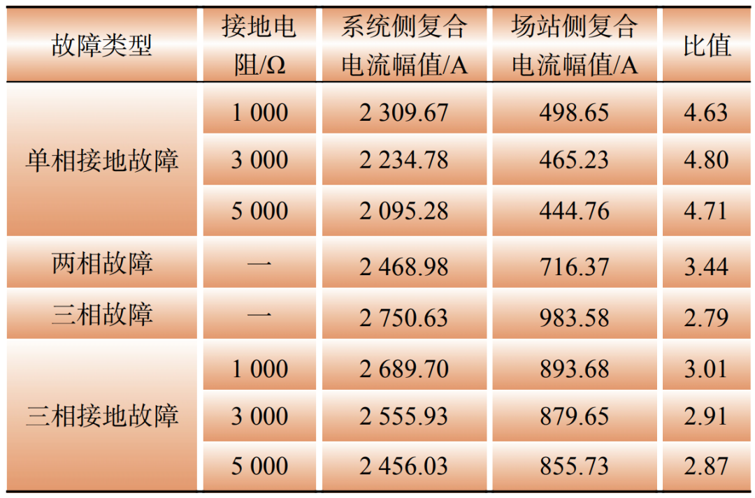 本文設(shè)置不同的故障條件判斷在新能源集中外送場(chǎng)景下,采用的權(quán)重系數(shù)m1=m2=4,故障判別結(jié)果如表1所示。由表1可知,在構(gòu)網(wǎng)型新能源機(jī)組集中外送場(chǎng)景下,此時(shí)由正序分量構(gòu)造的保護(hù)判據(jù)幾乎無(wú)效,因此有必要利用復(fù)合序電流判據(jù)識(shí)別故障。當(dāng)外送線路發(fā)生故障時(shí),為正序突變量設(shè)置的權(quán)重會(huì)放大兩側(cè)的故障特征,放大兩側(cè)復(fù)合序電流的幅值差異。其中,若發(fā)生不對(duì)稱故障,則為負(fù)序分量設(shè)置的權(quán)重會(huì)進(jìn)一步放大的兩側(cè)故障特征,使兩側(cè)復(fù)合序電流呈現(xiàn)出明顯差異??梢?jiàn),在不同故障條件下系統(tǒng)側(cè)與場(chǎng)站側(cè)的復(fù)合序電流幅值比均大于可靠系數(shù),因此本文提出的復(fù)合序電流判據(jù)可以準(zhǔn)確識(shí)別構(gòu)網(wǎng)型新能源集中外送場(chǎng)景下送出線路的故障。